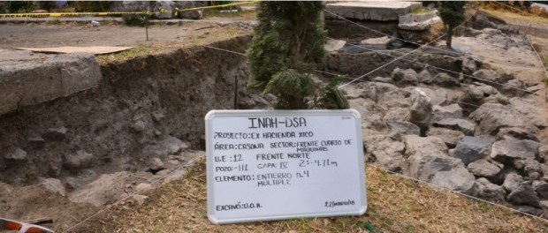 Hacia la fachada de la casa grande, frente al que fuera cuarto de máquinas, el equipo de la DSA excava una serie de entierros ubicados en el núcleo e interior de grandes plataformas. El arqueólogo Ulises Ortiz Hernández comenta que los enterramientos fueron ofrendados a las estructuras prehispánicas, que en este caso datan de la fase Coyotlatelco, entre 750 y 950 d.C.; y depositados de forma directa sobre la tierra.