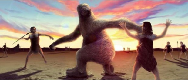 Fotografía: Recreación de cómo era la cacería del perezoso gigante, por Alex McClelland. Universidad de Bournemouth