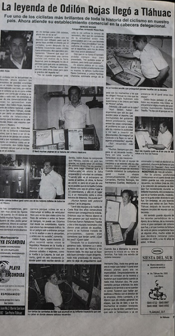 «El ciclismo en la actualidad es diferente, ahora existen los patrocinios de grandes empresas, pero al mismo tiempo estas han comercializado casi todo, por eso es que el ciclismo ya no es como antes cuando uno corría por el amor a su equipo y nada más; sin embargo, a pesar de esa comercialización los jóvenes no aprovechan esas ventajas», dice Odilón Rojas, leyenda viviente del ciclismo nacional, y quien radica en San Pedro Tláhuac, donde abrió por cierto un establecimiento para venta de refacciones y accesorios para bicicletas en la calle de Nicolás Bravo casi esquina con Francisco I. Madero.