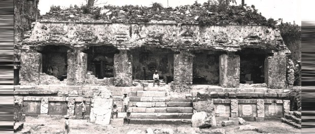 Fotografía superior: Gran patio del Palacio de Palenque. Fotografía Alfred Maudslay, Trustees of the British Museum