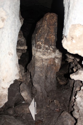 Los especialistas del Centro INAH Quintana Roo comentan que, aunque la cueva ha sido nombrada como el Templo de La Estalagmita, en realidad el espeleotema parece corresponder a una estalactita que fue extraída de otra cavidad y clavada invertida a su forma natural. Las exploraciones futuras permitirán aclarar este punto.