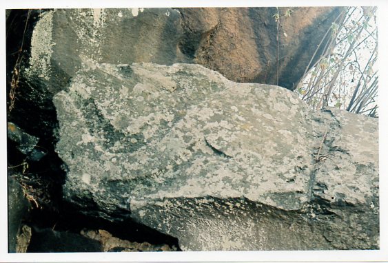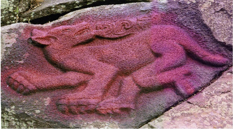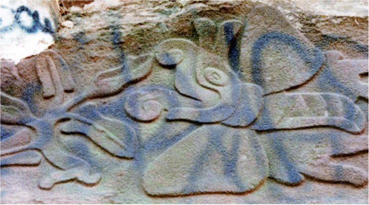 Los relieves descubiertos más recientes están donde se encuentra la piedra tallada con el sacerdote sobre una réplica de templo en miniatura. Ahí a pie de monte, justo al fondo del camino, sale de la falda una piedra alargada y ahí, donde empieza, se esculpió la cola de un gran felino; luego hay una incisión arriba y abajo, el diseño barrado y justo antes de concluir su otro extremo, se talló la cola enroscada de otro animal pequeño. Tal vez es una escena de una familia donde las crías juegan con su madre.