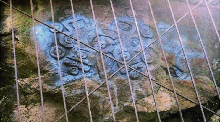 Arriba de esta escena está la cabeza pétrea de la anciana que le da nombre al sitio de Cuahilama y que también se pensaba que era una deidad femenina, Cihuacoatl.