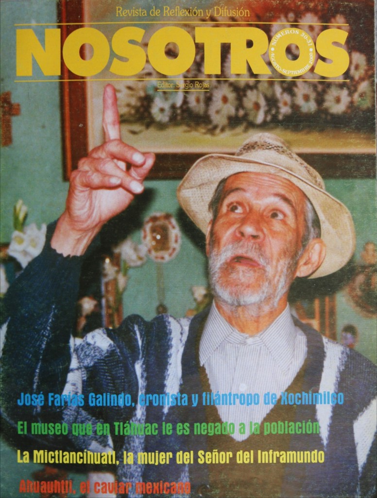 Sí, José Farías Galindo es el cronista de Xochimilco, el entrañable amigo del pintor zacatecano Francisco Goytia. Casi todos ahí lo conocen porque ha sido un hombre sencillo que ha dejado buena parte de su vida en las aulas y también ha dedicado muchos años a difundir la historia y las tradiciones culturales de su comunidad, entre su gente y la de otros lados. Estudió en la Escuela Nacional de Maestros y en la Escuela Nacional de Antropología, porque además es arqueólogo. Estudió en el Conservatorio Nacional de Música, tomó cursos de lenguas indígenas (náhuatl, otomí y maya); así como un curso de periodismo, lo que le permitió después ser fundador de cuatro periódicos en Xochimilco: Metztlixóchitl, Horizontal, Mundo e Informador.