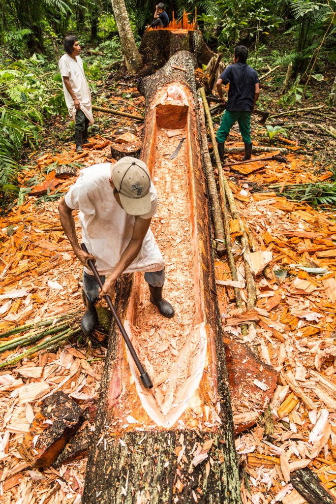 El tronco se dejó secar tres días enteros, luego de los cuales dio inicio el arduo proceso de tallado del cayuco y sus remos: con hacha para los cortes profundos y machete en el caso de los segmentos de mayor detalle; midiendo constantemente los niveles con un hilo pintado con tinta negra, el cual se usaba como guía.