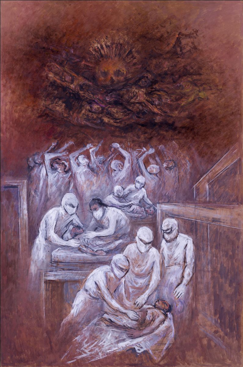 El azote mundial de la pandemia del coronavirus ha quedado plasmado en la obra del artista plástico Héctor Cruz García, de manera específica en el cuadro Enfrentando a la muerte, salvando vidas, donde recoge la desesperación y angustia de una humanidad consternada por la tragedia y los esfuerzos en tres planos del personal médico en su constante lucha por salvar de la muerte a infectados del virus.