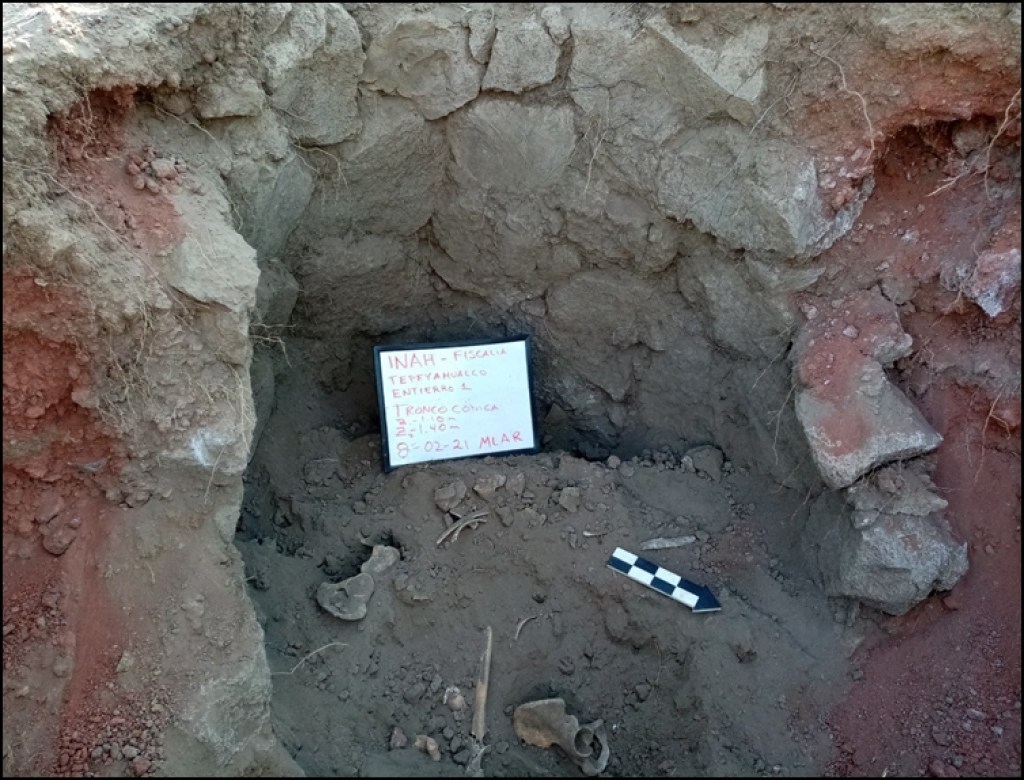 Durante la intervención, los arqueólogos pudieron definir que al interior del subsuelo, compuesto de fina gravilla de tezontle color rojo, se localizaron las paredes de lo que conformaba una tumba troncocónica, un sistema constructivo en forma de botella, con paredes de piedra careadas, pulimentadas hacia el interior; mientras que al exterior conservaban la forma natural de la roca basáltica. Son características del periodo Formativo, que corresponde al año 300 a.C.; se han localizado al sur de la Cuenca de México, en Cuicuilco, y en la región de occidente, en Guanajuato y Michoacán.