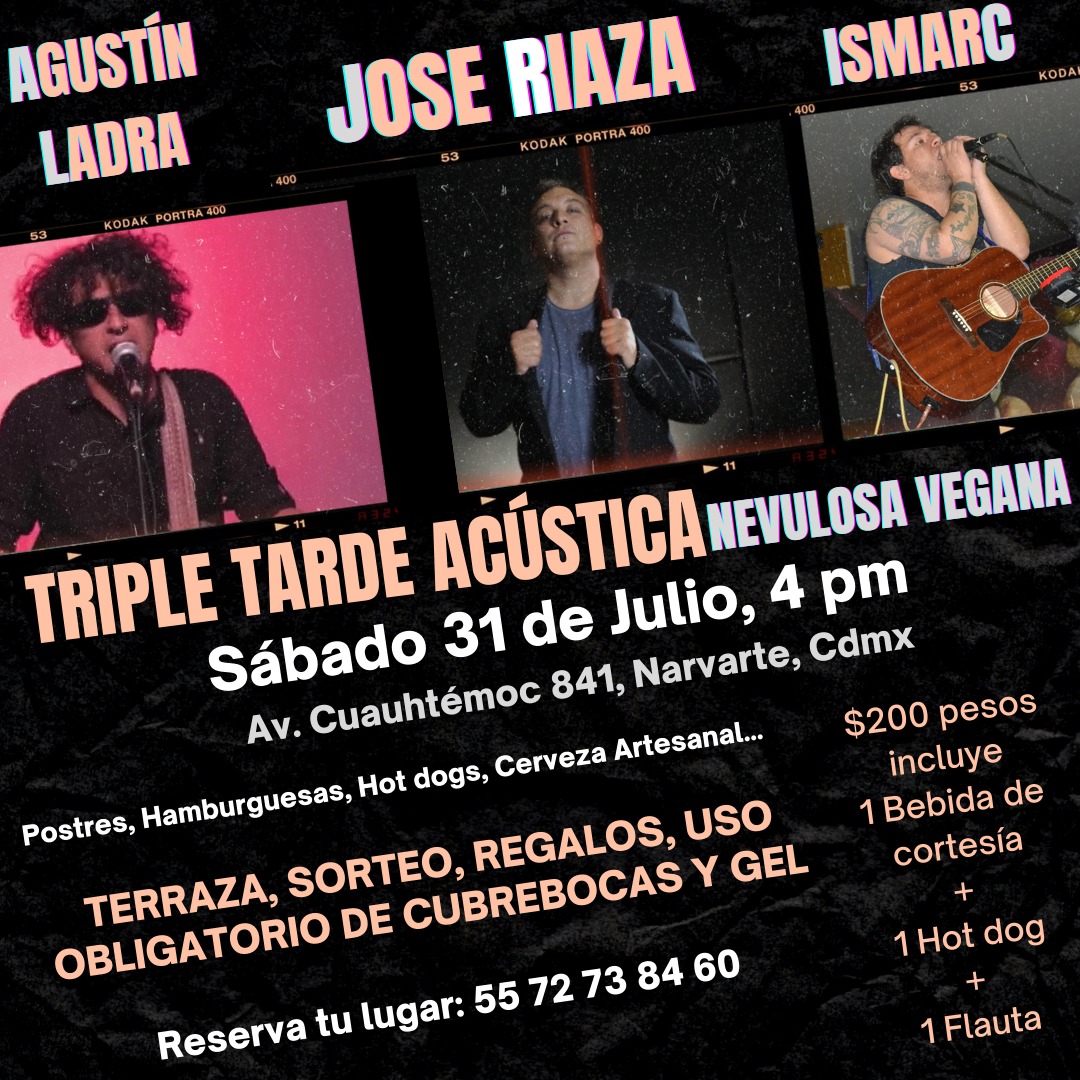 Por lo pronto, el sábado 31 de julio compartirán escenario José Riaza, Agustín Ladre e Ismarc, en el marco de lo que han llamado Triple Tarde Acústica Nevulosa Vegana, en un salón de Avenida Cuauhtémoc 841, Colonia Narvarte de la Ciudad de México. La velada dará inicio a las 16 horas y se puede hacer reservación al número telefónico 55 7273 8460. ♦