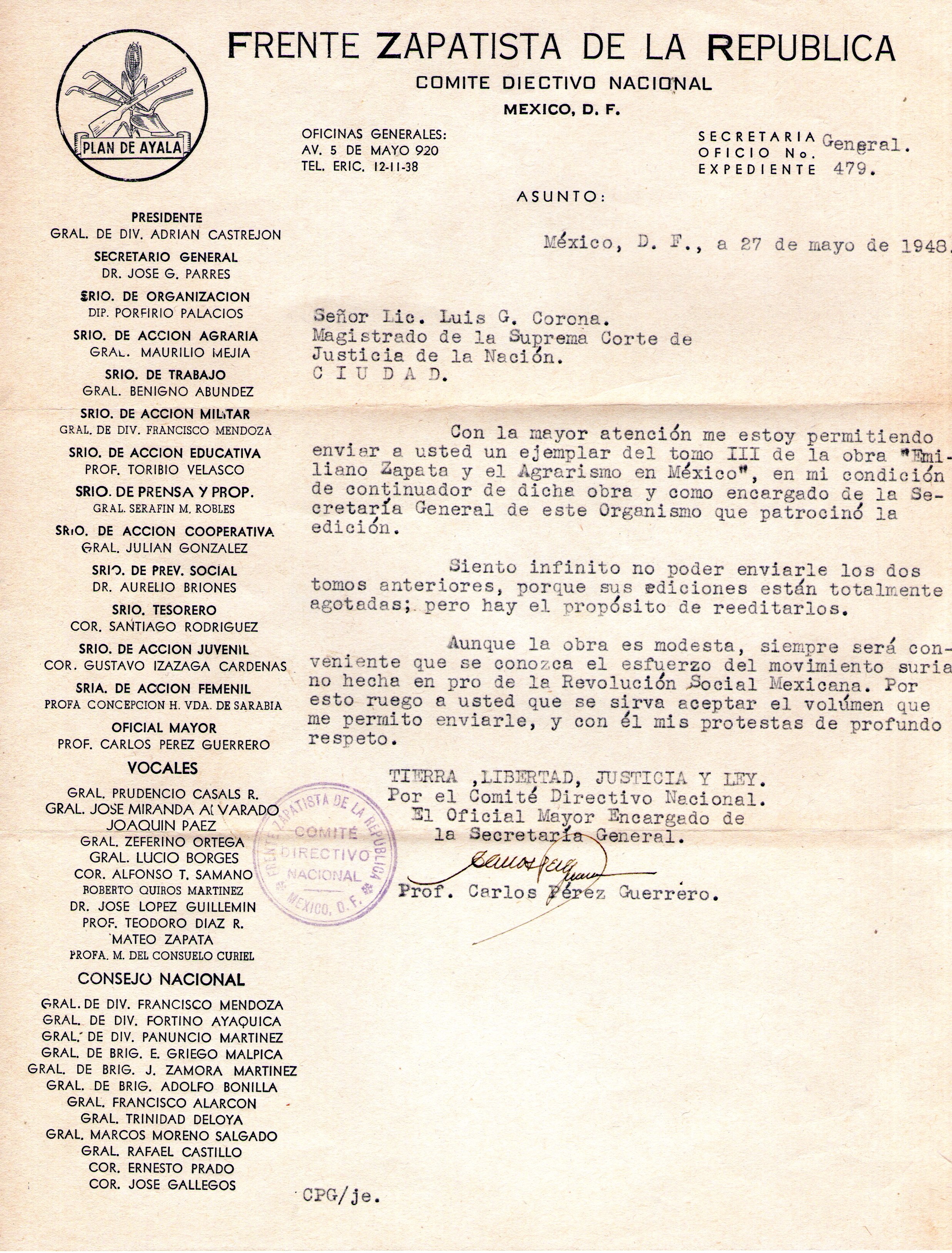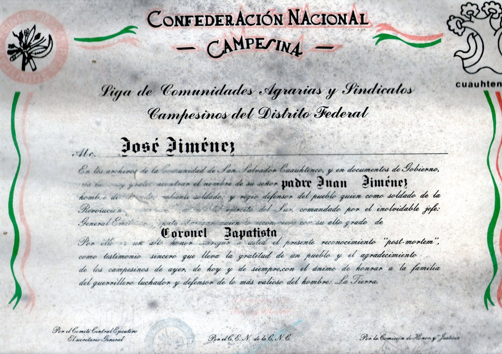 «En los archivos de la comunidad de San Salvador Cuauhtenco, y en documentos de gobierno, es muy grato encontrar el nombre de su señor padre Juan Jiménez, hombre dedicado y valiente soldado; regio defensor del pueblo quien como soldado de la Revolución (ilegible) del Ejército del Sur, comandado por el inolvidable jefe General Emiliano Zapata Salazar, quien lo reconociera con su alto grado de Coronel Zapatista».