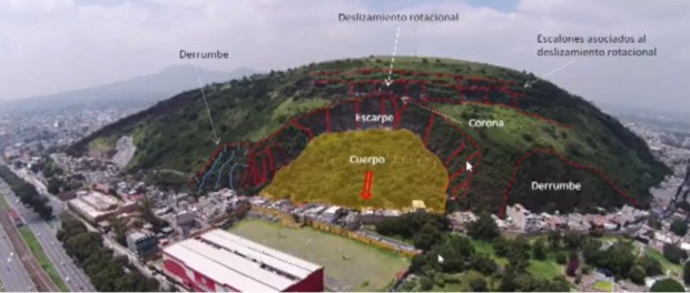Esa formación es un volcán extinto que data del periodo Cuaternario, iniciado hace 2.59 millones de años, el cual no sólo ha sido minado para el establecimiento humano, sino también atravesado por dos fallas de pendiente activas.