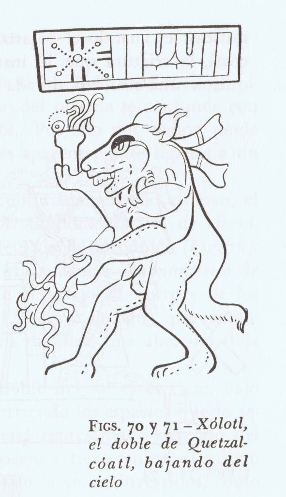 Identificado algunas veces con el planeta Mercurio[1], Xólotl, el dios perro, gemelo de Quetzalcóatl, es el que acompaña al inframundo a la serpiente emplumada para robar los huesos que, molidos y mezclados con sangre, darán lugar al hombre. Episodio referencial gracias al cual sabemos porqué el perro es necesario en las ofrendas funerarias de algunos pueblos mesoamericanos, del por qué se hace importante la presencia de un perro para que el hombre entre al inframundo, al reino de Mictlatecuhtli, señor de la muerte.