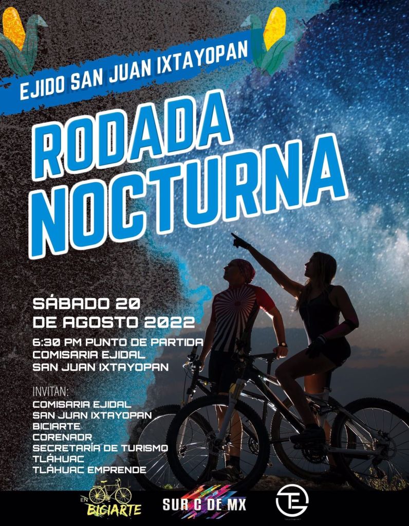 Una rodada ciclista nocturna bajo el cielo de San Juan Ixtayopan en la Alcaldía Tláhuac se llevará a cabo la noche del sábado 20 de agosto, organizada por el grupo BiciArte, dedicado a promover el turismo local.
