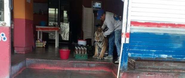 Un transeúnte logró captar la imagen del tigre cuando era sacado del interior de la taquería, debido a que lo atrajo el olor a carne.