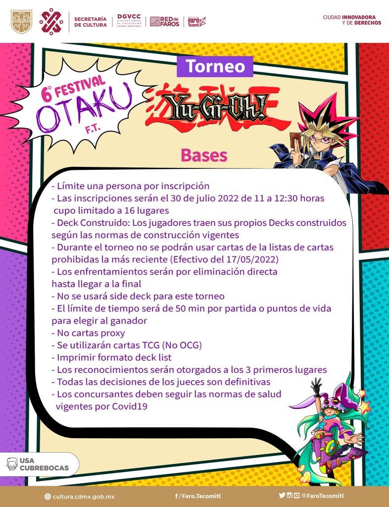 El sexto Festival Otaku se llevará a cabo este sábado a partir de las 12 horas en el Faro Tecómitl, Alcaldía Milpa Alta, con actividades, concursos de Cosplay, gastronomía oriental, doblaje, torneos de Yu-Gi-Oh! y de Pokemon GO.