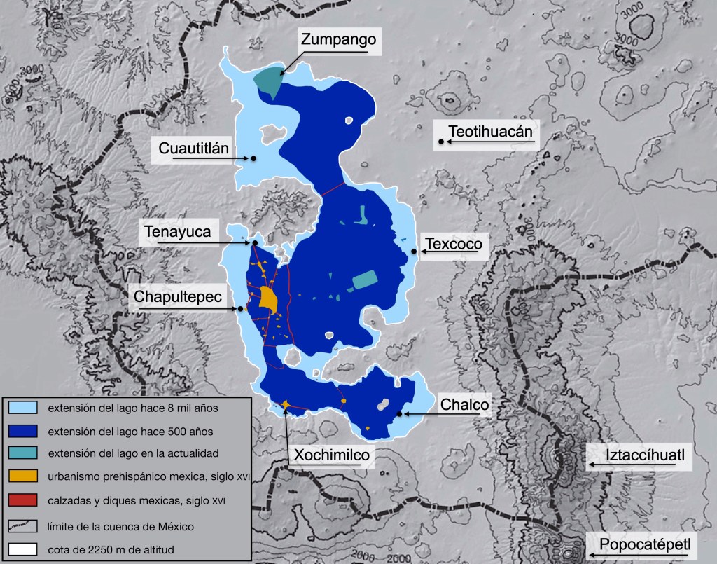 Formada por fenómenos eruptivos hace 700,000 años, e integrada por las aguas dulces de los lagos de Chalco y Xochimilco, y las salobres de los lagos de Texcoco, Xaltocan y Zumpango, la Cuenca de México comenzó a menguar su extensión de 600 km², apenas conquistada Tenochtitlan.