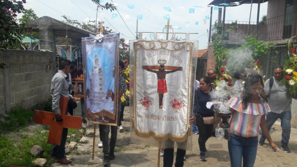 Encabeza nuestro contingente el estandarte del Señor de las Misericordias, también conocido como Leñerito de San Pedro Atocpan y el estandarte de San Gregorio de Los Compadres y Amigos de a Caballo, que desde hace ya siete años acompañan al Leñerito para presentar su ofrenda de flores y cohetes en honor a Santa María Magdalena, patrona de Amatlán, municipio de Tepoztlán, Morelos.