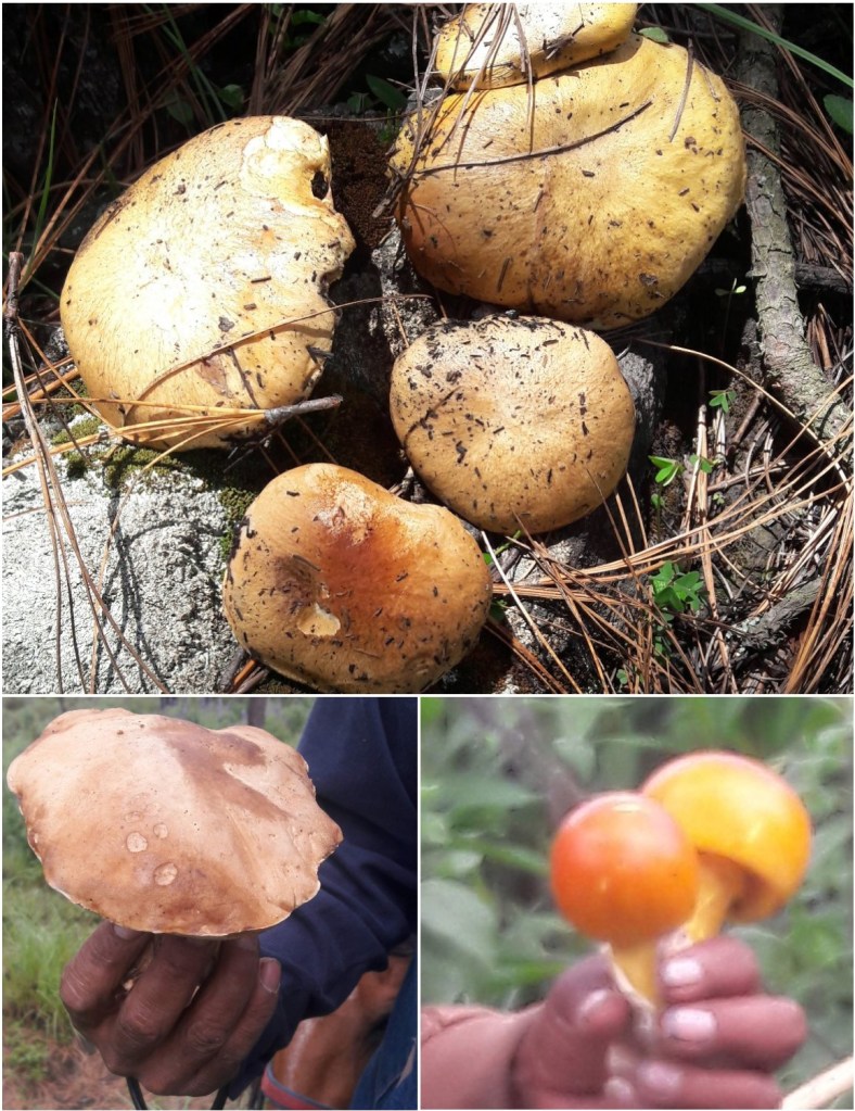 El compadre Francisco (alias) Cush, se afana en cortar diversos tipos de hongos: escobetas, claras de huevo, babositas, cemitas y jícaras que completarán la cena de pozole que nos ofrecerán los mayordomos de Amatlán.