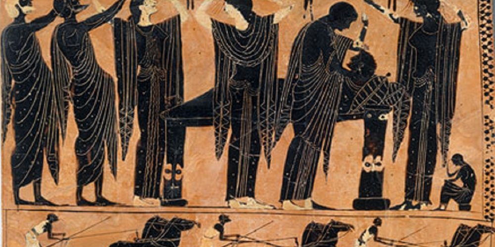 El funeral se iniciaba con la siembra de un árbol en la casa del finado en calidad de duelo, después habían acciones de danza, de música y, sobre todo, de plañideras (lloradoras), que siguiendo el féretro acompañaban a la familia vestidos de negro, seguían el féretro junto con los hijos que se cubrían la cabeza y con las hijas que sin velo caminaban junto al difunto hasta un lugar escogido en el que estaba instalada una pira en la que se quemaba el cadáver, pero antes se le perfumaba y el familiar más cercano prendía la hoguera, se recogían las cenizas y éstas se guardaban en un panteón familiar.
