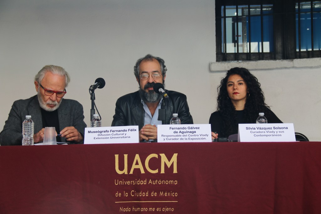 En rueda de prensa, el museógrafo Fernando Félix, Coordinador de Difusión Cultural y Extensión Universitaria de la UACM; Fernando Gálvez de Aguinaga, responsable de Centro Vlady, y Silvia Vázquez Solsona, curadora de la muestra, dieron pormenores del origen de esta exposición, así como las implicaciones de la trayectoria de Vlady en la escena artística nacional.