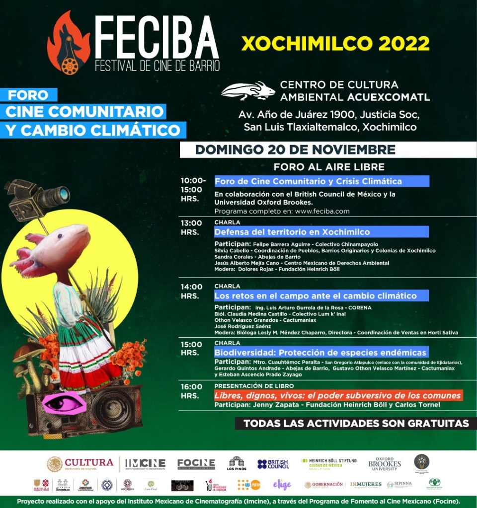 En la categoría de «Mi barrio me respalda » el Feciba se enfocó en la promoción de los derechos humanos con actividades complementarias como charlas, talleres y exhibiciones especiales, en donde se incluyen diferentes ejes temáticos. En este marco, tendrá lugar el Primer Foro de Cambio Climático y Cine Comunitario con actividades enfocadas en promover el cuidado y protección del medio ambiente, donde el cine será una herramienta más para combatir el cambio climático. Dicho foro se presenta en alianza con colectivos locales de Xochimilco, British Council de México y la Universidad Oxford Brookes.