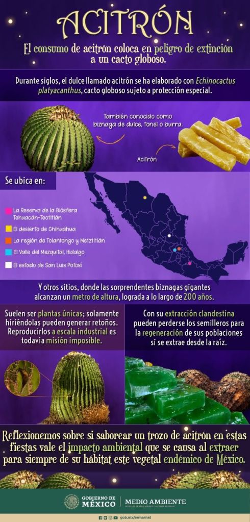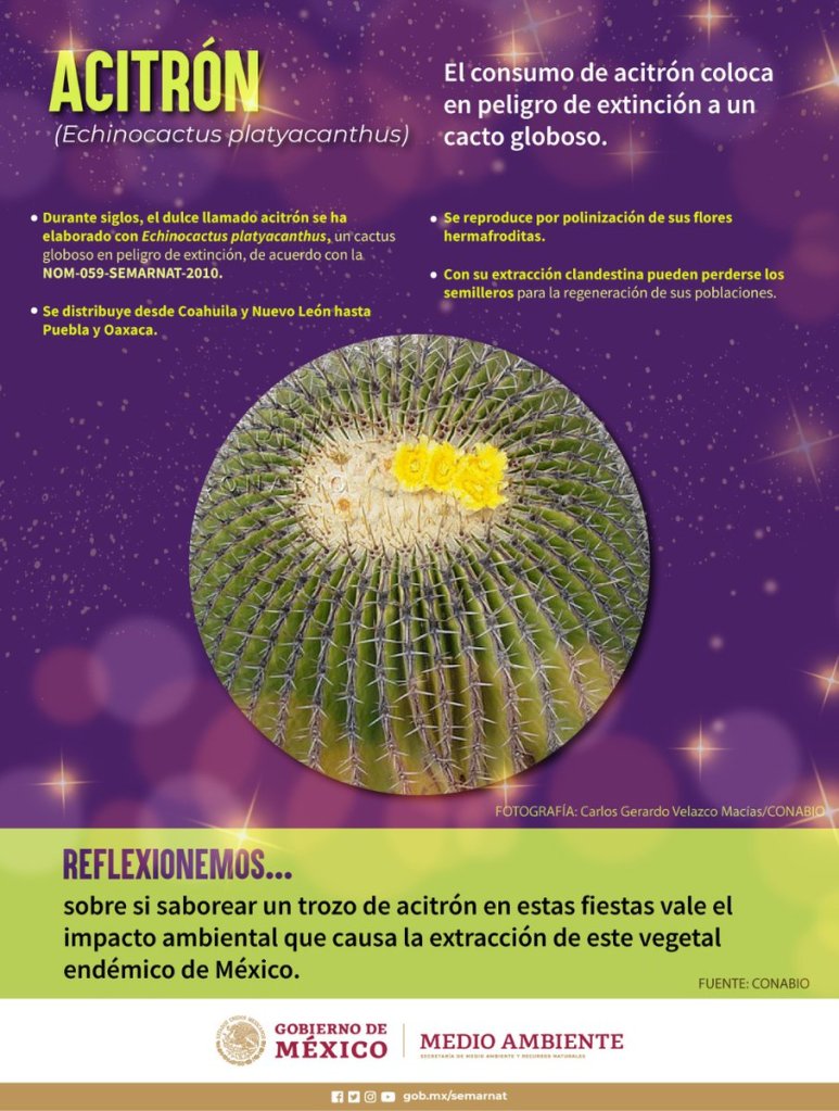 Por muchos años el acitrón formó parte de la gastronomía mexicana, sobre todo en la rosca de Reyes, tamales, chiles en nogada y pavo navideño. Sin embargo, este dulce cristalizado no debe consumirse, debido a que su elaboración pone en peligro de extinción a un cacto globoso conocido como Echinocactus platyacanthus y otras biznagas nativas de México y del continente americano.