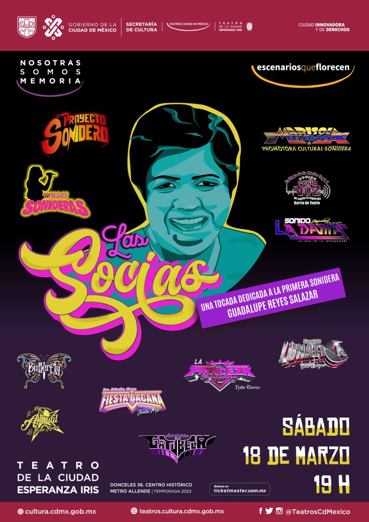 «Las Socias. Una tocada de Musas Sonideras», dedicada a la primera sonidera de México se llevará a cabo el sábado 18 de marzo, a las 19:00 horas, en el Teatro de la Ciudad Esperanza Iris (Donceles 36, Centro Histórico, cerca del Metro Allende).