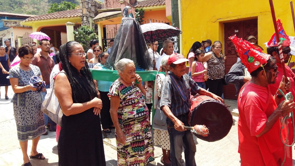 Entretanto, la representación del juicio de Jesús transcurre bajo el domo de la cancha comunitaria, de la que saldrá con vestido púrpura para emprender la procesión en la que será acompañado de La Dolorosa, cuya imagen es cargada por mujeres mayores, con el sonido fatigoso del tambor y el acordeón, hasta expirar en la cruz que llevaba a cuestas.