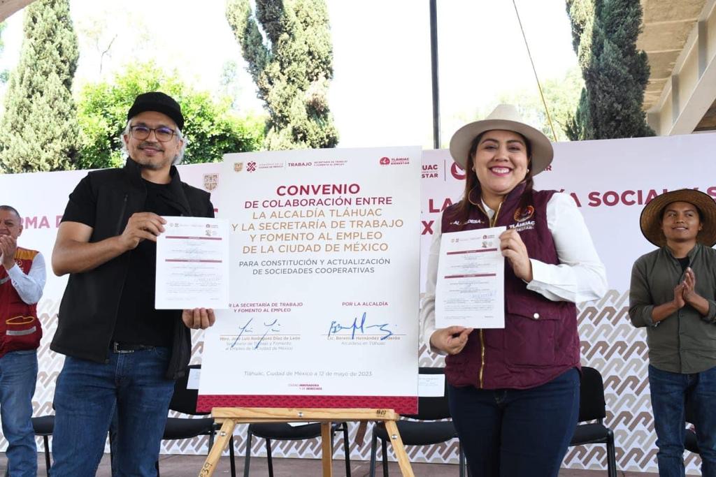 En compañía de José Luis Rodríguez Díaz de León, secretario del Trabajo y Fomento al Empleo de la Ciudad de México; Monserrat Navarro Pérez, directora general de Economía Social y Solidaria de la Secretaría del Trabajo y Fomento al Empleo de la Ciudad de México; Julio Dávila Aceves, director general de Empleo de la Secretaría del Trabajo y Fomento al Empleo de la Ciudad de México; Antonio Rangel Lara, director general de Desarrollo Económico y Rural de la alcaldía Tláhuac, e Iván Bautista Osorno, representante de la cooperativa Valedores Verdes, firmaron el Convenio de Colaboración para la Constitución y Actualización de Sociedades Cooperativistas en Tláhuac.