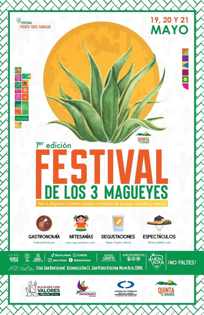 El Primer Festival de los 3 Magueyes se llevará a cabo en la Quinta El Mirador, ubicada en el kilómetro 15 de la carretera a San Bartolomé Xicomulco, en San Pedro Atocpan, Alcaldía Milpa Alta.