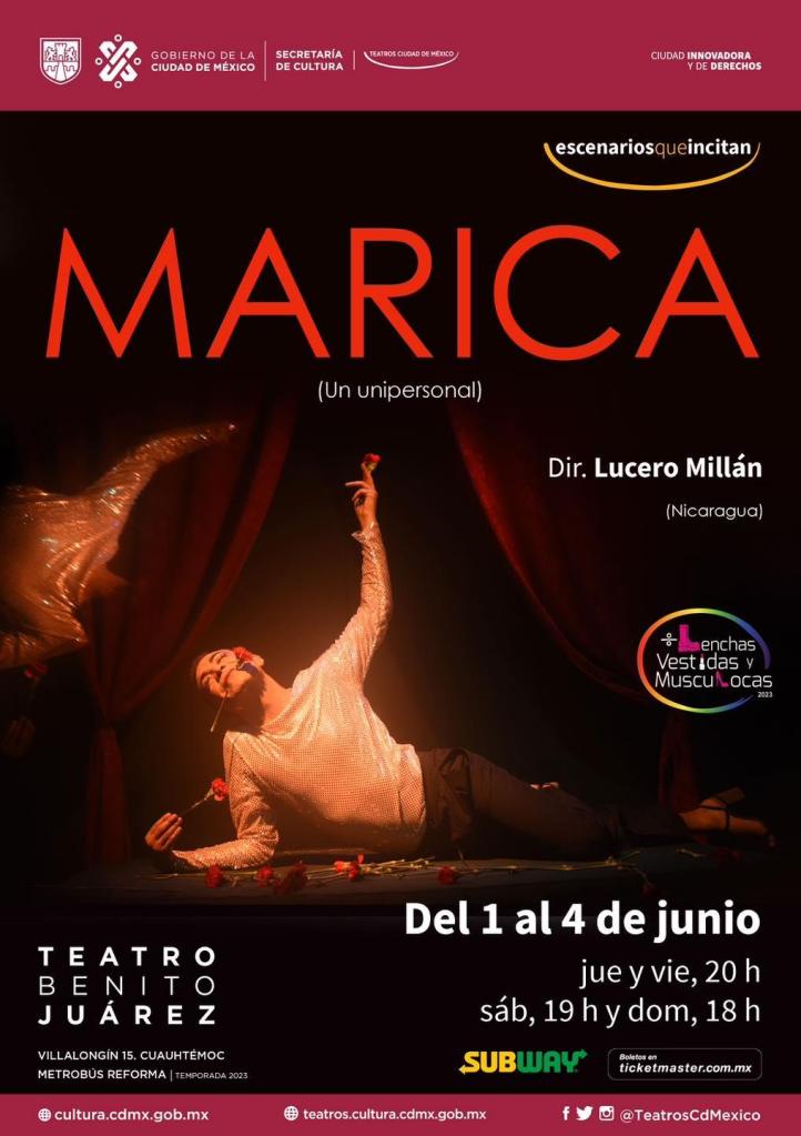 Marica se presentará el jueves 1 y viernes 2 de junio a las 20:00 horas, sábado 3 a las 19:00, y el domingo 4 de junio a las 18:00 horas, en el Teatro Benito Juárez (Villalongín 15, colonia Cuauhtémoc, Metrobús Reforma). Admisión: Entrada general, $184. Los boletos se pueden adquirir en la taquilla del teatro y en las plataformas digitales de Ticketmaster. ♦