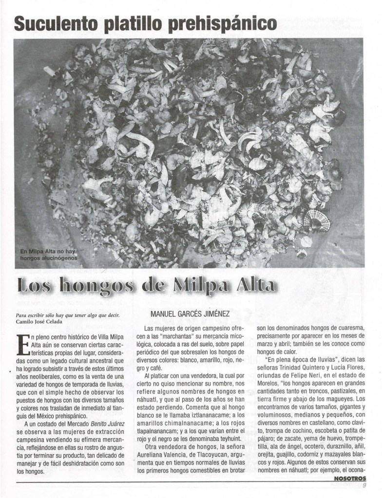 En pleno centro histórico de Villa Milpa Alta aún se conservan ciertas características propias del lugar, consideradas como un legado cultural ancestral que ha logrado subsistir a través de estos últimos años neoliberales, como es la venta de una variedad de hongos de temporada de lluvias, que con el simple hecho de observar los puestos de hongos con los diversos tamaños y colores, nos trasladamos de inmediato al tianguis del México prehispánico.