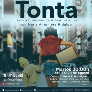 Es una comedia irreverente de Adrián Vázquez, protagonizada por María Antonieta Hidalgo, que se presentará a partir de este martes 8 de agosto en el Centro Cultural Hormiguero, en la Ciudad de México.