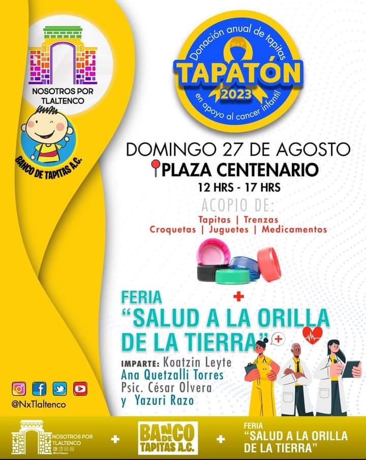 Este domingo en San Francisco Tlaltenco, Alcaldía Tláhuac, se llevará a cabo la Feria «Salud a la orilla de la tierra», así como el «Tapatón 2023», en el que se recibirán tapitas, juguetes, croquetas, trenzas y medicamentos, informó la agrupación Nosotros por Tlaltenco.