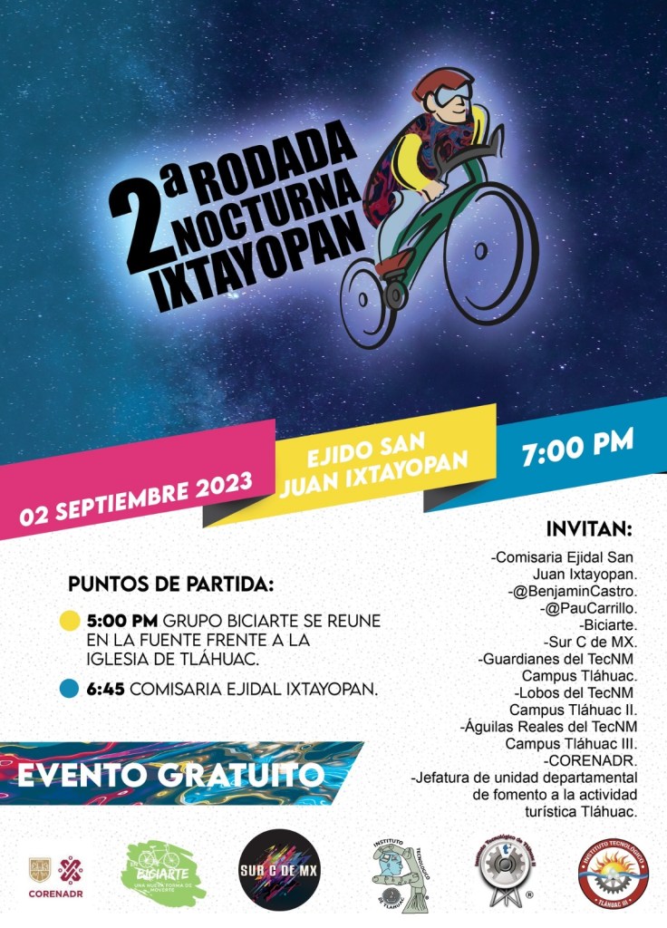 Como parte de las acciones que fomentan el uso de la bicicleta, el turismo local, así como la promoción de actividades recreativas y culturales en el suelo de conservación de la Ciudad de México, se lleva a cabo la rodada nocturna, con apoyo de la Comisaría Ejidal de San Juan Ixtayopan y la Comisión de Recursos Naturales y Desarrollo Rural (Corenadr).