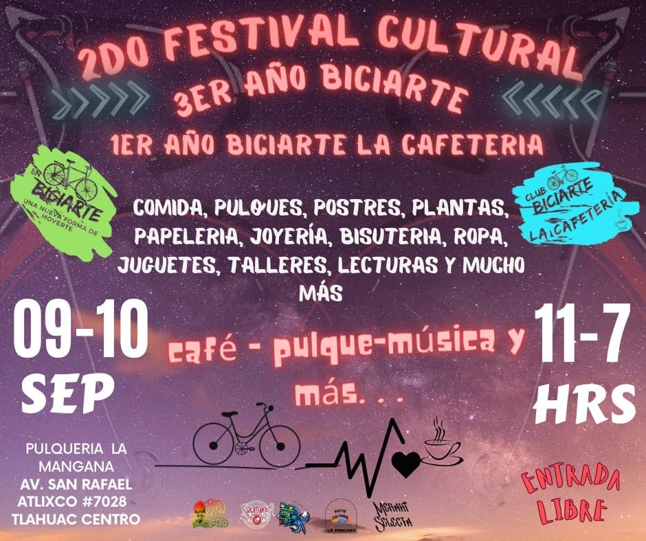 Las colaboraciones que se han sumado al Segundo Festival Cultural son: Xipe-Totec, Tlaloca Sound, Selecta Meraki y Sahi, quienes han participado en el transcurso del año en los Viernes Culturales del foro abierto en BiciArte la Cafetería, con música de distintos géneros, literatura y más.