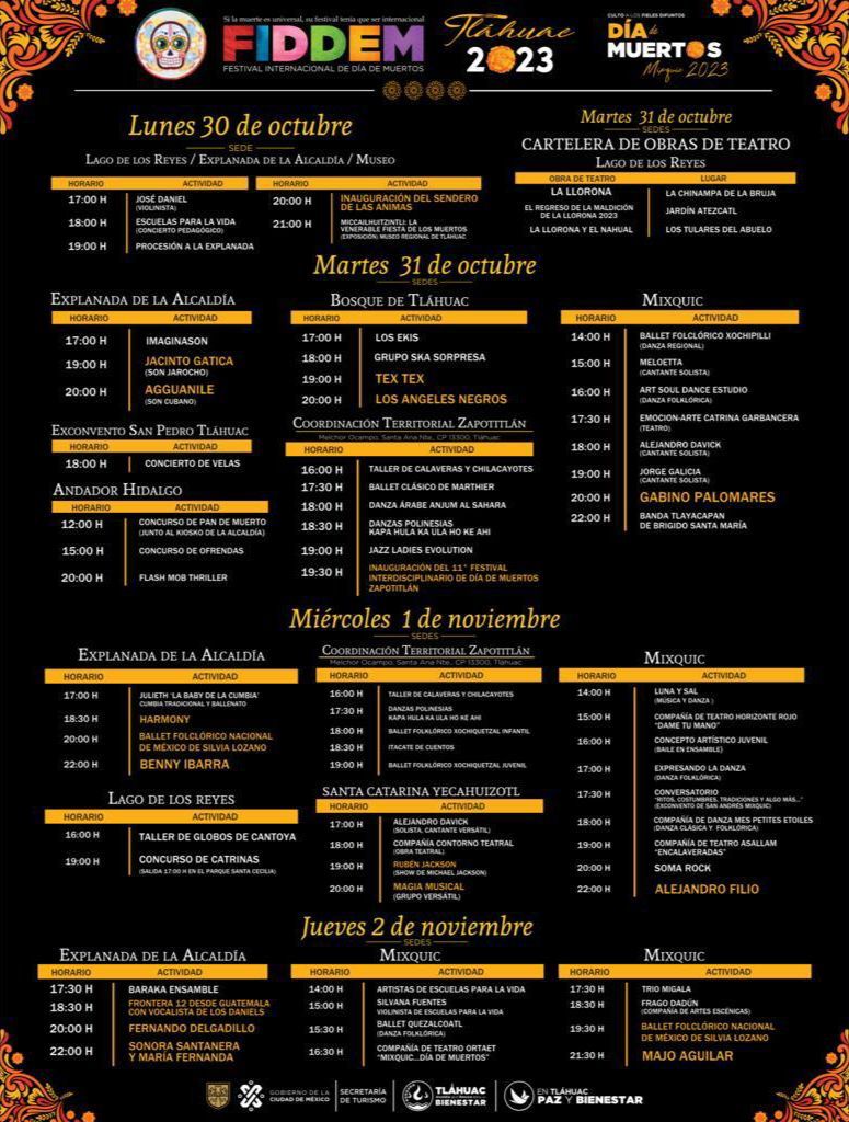 Muchas son las expresiones artísticas y culturales con las cuales se rinde culto a los fieles difuntos y el Festival Internacional de Día de Muertos (FIDDEM) Tláhuac 2023, es un homenaje a la gran tradición prehispánica de los pueblos de la cuenca de México que aún perdura en barrios y colonias de la demarcación.