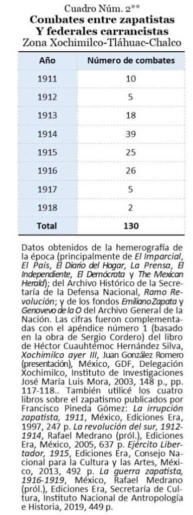 De 1911 y hasta 1916, por lo menos, los combates y operaciones militares zapatistas fueron en incremento en la región de Tláhuac, sobre todo, en el marco de los diversos preparativos para ocupar la ciudad de México por parte de los surianos: en septiembre de 1912, a mediados de 1913 y a finales de 1914; en esta última, por cierto, lograron su cometido el 27 de noviembre (véase cuadro Núm. 2). Sin la participación de los pueblos del Distrito Federal, de la zona serrana y de la lacustre, el Ejército Libertador difícilmente habría podido ocupar la capital de la República, no obstante, gracias al decidido y multitudinario apoyo de los nahuas locales, la revolución campesina penetró y destruyó el vetusto corazón del poder colonial impuesto desde el siglo XVI. Pocos meses después, y ante una nueva avanzada carrancista, los zapatistas llevaron a cabo su mayor operativo militar alrededor de la Cuenca de México, abarcando un radio de 1,490 km2, y de esta forma, recuperaron el control total del Distrito Federal. En esta acción estratégica, San Pedro Tláhuac se convirtió en un sitio fundamental para la planeación de los avances surianos y en el centro de operaciones más importante, ya que el propio Emiliano Zapata, desde ahí, dirigió los trabajos correspondientes antes de marchar hacia Iztapalapa.