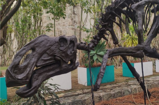 El «Sabinosaurio» es una reproducción a escala natural de un fósil de dinosaurio herbívoro conocido como pico de pato, que vivió entre 83 y 70 millones de años y fue descubierto en 2001, en Sabinas, Coahuila.