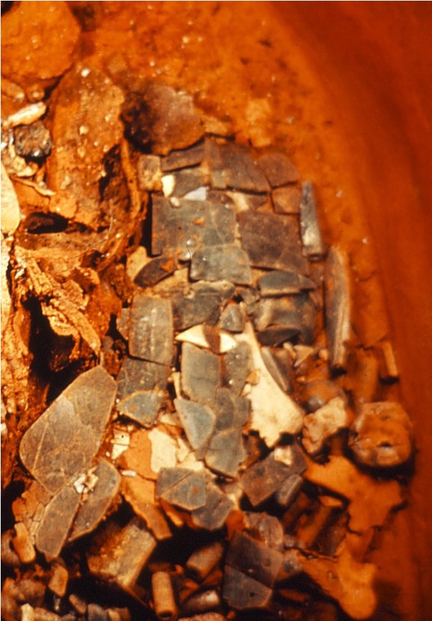 Debajo de las teselas, expuso, aparecieron diversos materiales, como capas de espuma de poliuretano, plastilina y pastas de colores ocre, rojo y amarillo, que fueron utilizadas para fijar las piezas de jade que constituyen la máscara.