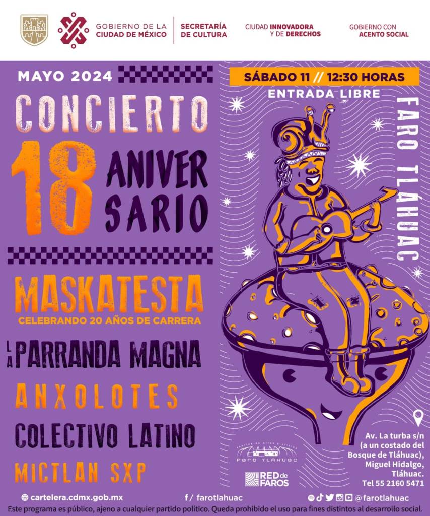 La Fábrica de Artes y Oficios (Faro) Tláhuac festeja su 18 aniversario con diversas actividades gratuitas el sábado 11, el martes 14 y los días domingo 19 y 26 de mayo, como conciertos de ska, exposiciones, teatro infantil, la novena edición de su picnic gótico y un baile familiar que mezcla ritmos como salsa y son cubano.