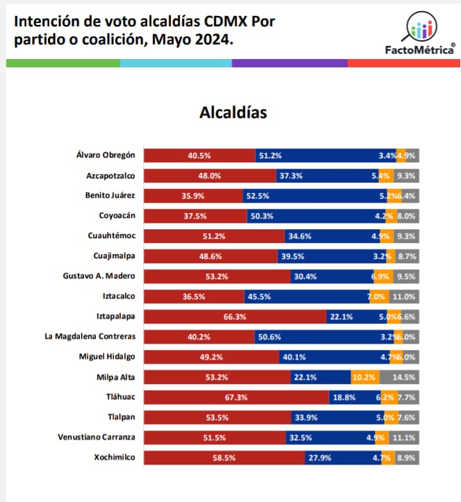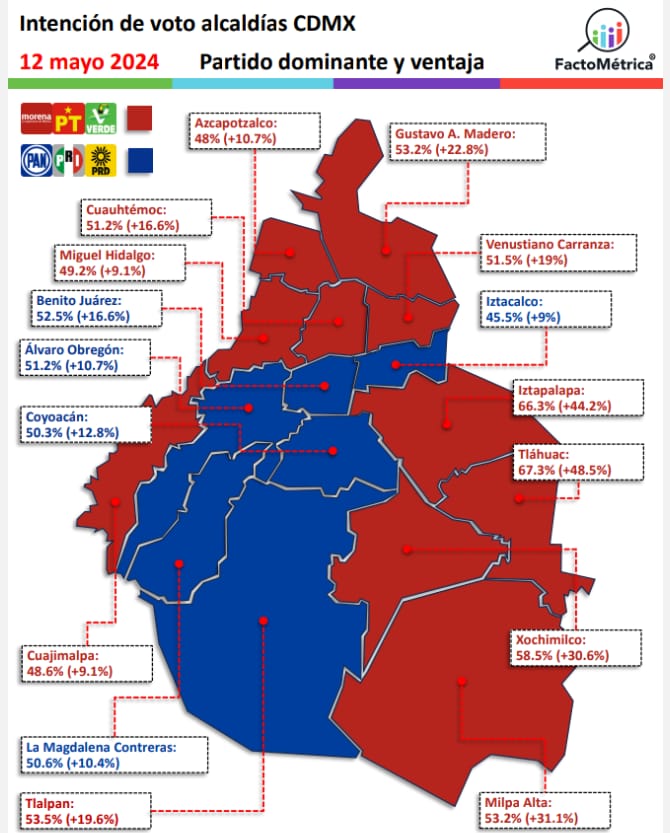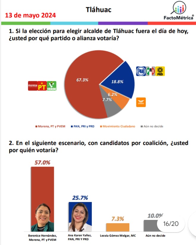 Tláhuac se consolidó como bastión del morenismo en la capital del país, de acuerdo con los resultados del más reciente sondeo realizado por la encuestadora FactoMétrica, tras la pregunta de si la elección para elegir alcaldesa fuera el día de hoy, usted ¿por qué partido o alianza votaría?, a lo cual 67.3% de los ciudadanos consultados respondió que lo haría por la coalición «Sigamos Haciendo Historia».
