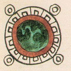 Es un glifo de simbolismo dual[15], por un lado es claramente topográfico, ya que denota las características físicas de la locación geográfica; además, obedece también a una simbología más compleja que alude al nacimiento de un nuevo ser, pues están presentes los elementos de lo que Gutierre Tibón[16] llama la tríade prenatal, es decir, la placenta o cama del niño, el funículo o cordón umbilical que une al niño con la madre y el amnios o bolsa amniótica[17].