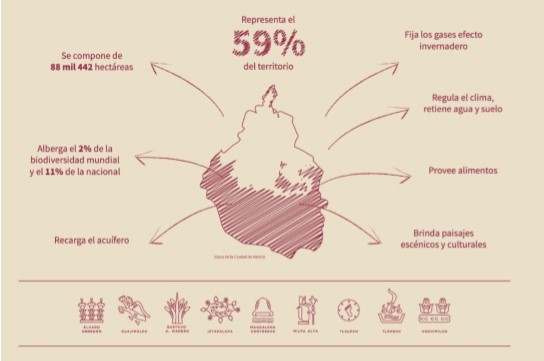 En estas zonas se generan servicios socioambientales vitales para la vida en la Ciudad, como la captura de carbono, la generación de oxígeno, la infiltración de agua, la producción de alimentos y la provisión de espacios para la recreación y el turismo. El Suelo de Conservación se sitúa principalmente en las zonas montañosas y rurales de la Ciudad, extendiéndose a través de los territorios de las alcaldías de Xochimilco, Tláhuac, Tlalpan, Milpa Alta, Magdalena Contreras, Cuajimalpa, Álvaro Obregón, Iztapalapa y Gustavo A. Madero.