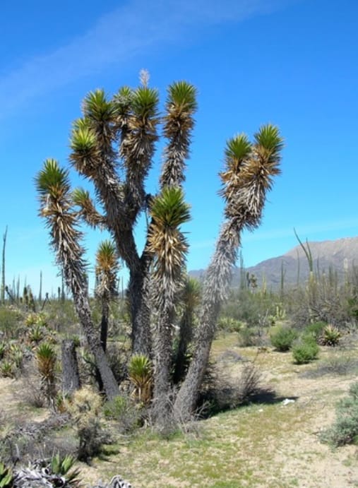 Arriba a la izquierda: árbol de Palo fierro; abajo, árbol de Palo adán, y a la derecha, Datilillo (Yucca valida), tomado de iNaturalist México