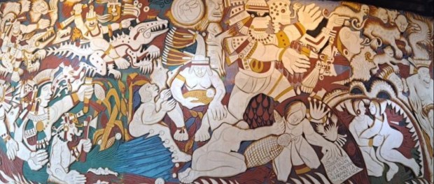 Pie de fotografía superior: Mural de Ariosto Otero Reyes, De dioses a animales, en el Planetario de Ecatepec «El gran Ehécatl. Los hijos del Dios del Viento»