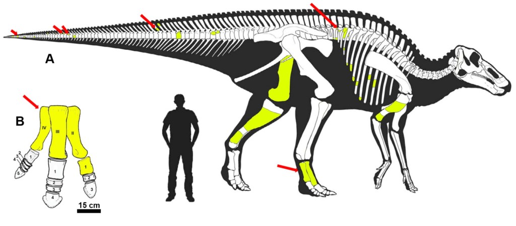 En dicha cantera se hallaron huesos de las patas traseras, incluido el fémur y tibia izquierdos, metatarsos y una falange de la pata derecha, varios elementos del esqueleto axial (vértebras y costillas) y un fragmento del parapeto del maxilar (hueso del cráneo correspondiente al área de los dientes superiores), que permitieron determinar que los restos pertenecen a un solo individuo de dinosaurio pico de pato no crestado (hadrosaurio saurolofino).