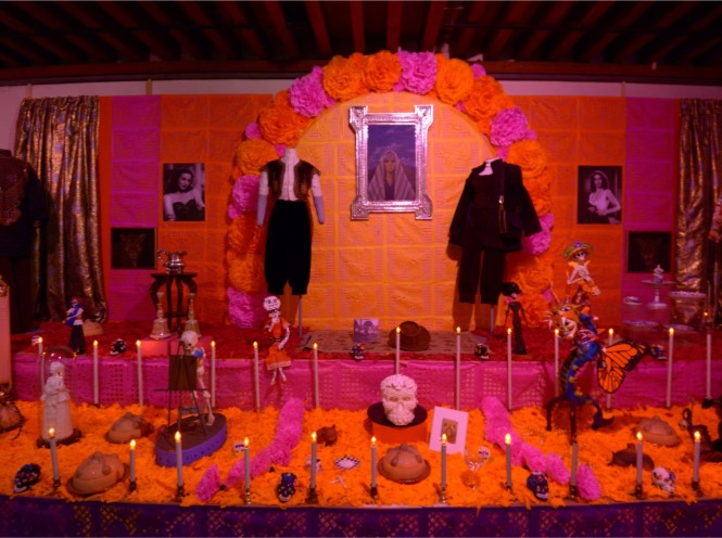 La muestra, Ofrenda de muertos a María Félix en San Ángel, está compuesta por 90 objetos pertenecientes, en su mayoría, a Fomento Social María Félix AC, y entre la gran variedad de elementos destaca el vestuario de la actriz, obra de diseñadores mexicanos y extranjeros, figurillas de cerámica, una colección de peines y cepillos, retratos, imágenes de escenas de sus películas y una catrina de cartón, de 2.20 metros de alto.