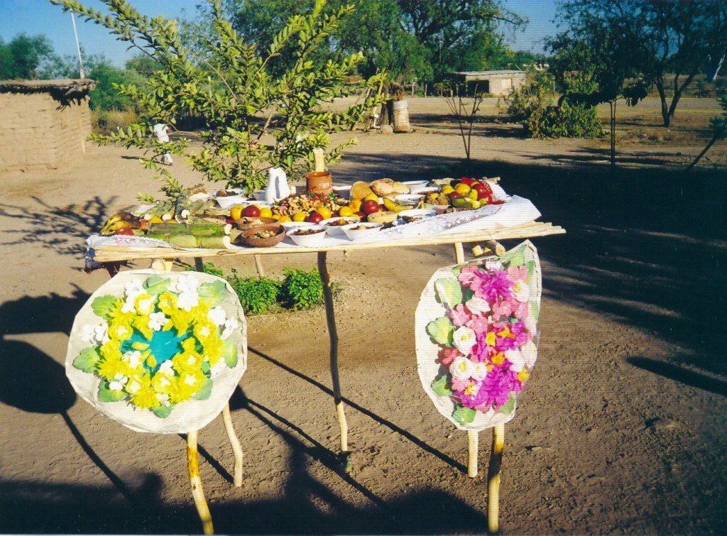 »El 1 de noviembre el tapanco amanece lleno de todo aquello que comía el difunto. En los pueblos yaquis, los rezanderos, acompañados de sus cantoras, pasan el día de solar en solar. Van bendiciendo y orando el rosario en cada tapanco, leyendo en una libreta ex profeso la letanía de nombres de todos los difuntos de la familia extensa. Su labor termina de madrugada, cuando los altares quedan con los elementos mínimos ya que los alimentos les son entregados al rezandero y sus cantoras.