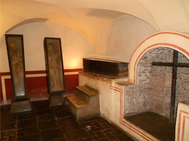 Las criptas están ubicadas bajo la nave de la iglesia, se destacan por el uso de azulejos de Talavera poblana del siglo XVII, con decoraciones murales y altares, un pequeño retablo dorado y pilas de agua bendita hechas de alabastro.