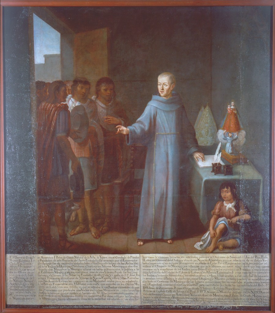 La primera evangelización sistemática que llegó a Mesoamérica fue en agosto de 1523, con tres primeros frailes franciscanos: Pedro de Gante, fray Juan de Tecto y fray Juan de Ahora. Sin embargo, estos dos últimos murieron durante la expedición a las Hibueras (Guatemala) capitaneadas por Hernán Cortés, por lo que su participación en la conversión de los indígenas fue corta y limitada, a diferencia de la de Pedro de Gante, cuyo papel como evangelizador y educador fue de primordial importancia en estas tierras de la naciente colonia española.